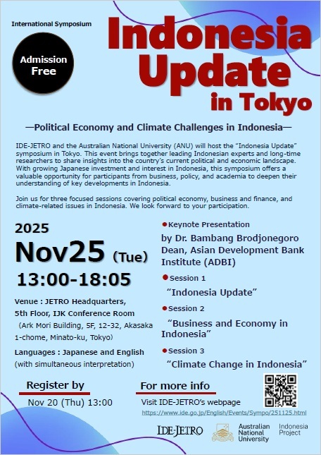 Given the significant investment by Japanese companies in Indonesia and the growing interest in the country, IDE-JETRO and ANU will host an “Indonesia Update” in Tokyo, with an expanded audience that includes the business community. The symposium aims to share insights from Indonesian experts and long-time researchers of Indonesia with Japanese stakeholders in business, policy, and academia.