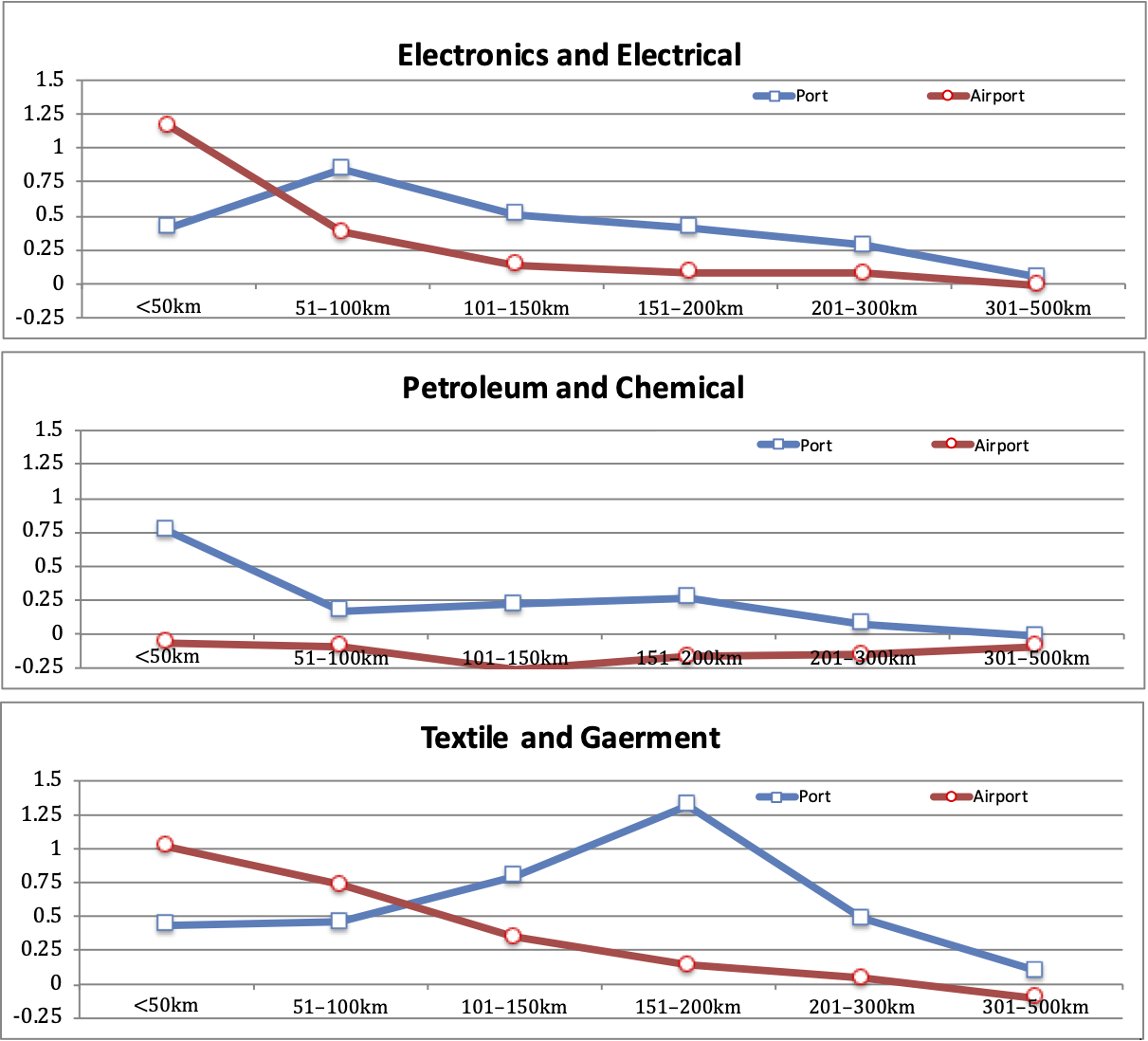 These findings highlight the complex relationship between transportation infrastructure and industrial location. They suggest that the optimal distance from ports and airports varies by industry, likely reflecting differences in transportation needs, the nature of inputs and outputs, and the role of face-to-face interactions in business operations.