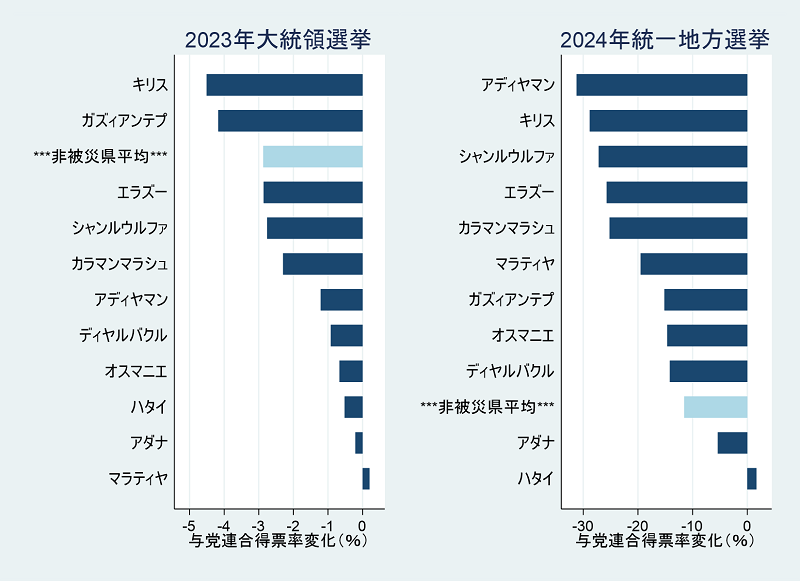 第2に、2023年2月トルコ南部大地震への政府の対応に対する有権者の最終審判が下った。地震被災11県では、2023年5月大統領選挙では政権による復興への期待からか、2018年大統領選挙と比べた与党連合票の落ち込みは他の県に比べて少なかった(図3)。与党連合の支持率が非被災地平均よりも低下したのは2県にとどまっていた。しかし今回の選挙ではそれが9県にまで増えた。そして与党連合下の8つの県庁所在市政のうち3つが野党市政に転じた(前掲図1)。