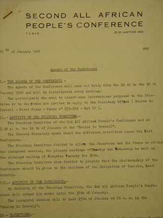 ここに紹介する2つの会議資料は、パンアフリカニズムの展開やアフリカの脱植民地化を検討する上できわめて重要なものである。「全アフリカ人民会議」は、アフリカ諸国が雪崩を打って独立を達成する直前の時期に、国家の代表ではなく人民の代表という資格で、主要政党や労働組合の指導者が一堂に会して開催された会議である。第1回はガーナの首都アクラで1958年12月に、第2回はチュニジアの首都チュニスで1960年1月に開かれている。
