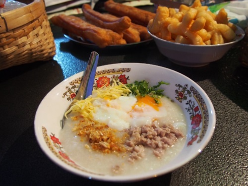 ジョークとカーオ・トムの違いが興味深い。「カーオ・トム」を直訳すると「煮たご飯」。見た目も似ているので両者の区別は難しいが、米粒の形が残っているお粥がカーオ・トムで、スープ状になるまで煮詰めたものがジョークなのだそうだ。ジョークには具ありと具無しの2種類がある。具ありジョークはさらに2つに分けられ、一つは米と具材を初めから一緒に煮込むもの。もうひとつは、具無しジョークに生の具材か火を通した具材を入れてさらに煮込むもので、例として豚肉のジョーク、鶏肉のジョーク、魚のジョーク、蟹のジョークなどが挙げられていた。これが屋台等で食べられる一般的なジョークではないかと思う。お好みで卵を添えると良い。