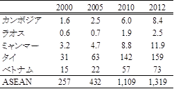 実際にこのモデルをもとに、CLMV諸国における現状、課題について議論してみよう。CLMV各国およびタイ、ASEANにおける対内直接投資額の推移が以下の表に示されている。