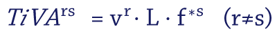 ただし、v^rは他国の要素を値0とするr国の付加価値係数(行)ベクトル、Lはレオンチェフ逆行列、f^(*s)はs国の国内最終需要(列)ベクトルである。右辺のL∙f^(*s)は、s国の(国産財および輸入財両方に対する)国内最終需要が、直接的・間接的に誘発した各国各産業への生産波及効果である。これを、r国の付加価値係数に掛け合わせることで、「s国の国内最終需要が誘発したr国の付加価値額」が求められる。これが、「r国のs国に対する付加価値輸出」(あるいは「s国によるr国からの付加価値輸入」)として計測されるものである。