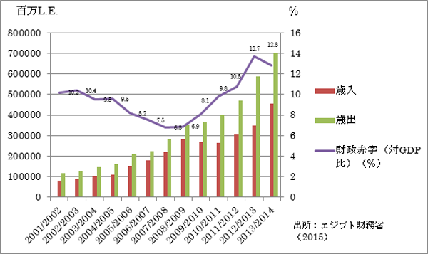 背景としての財政負担は大きい。ムバーラク政権期後半ナズィーフ内閣の前半にあたる2004年から2008年にかけては財政赤字も減少傾向にあったが、国際食糧危機の影響を受け、国内政治の不安定化の中で、以降は財政悪化の道を辿る(グラフ1参照)。この傾向は外貨準備高の危機的レベルまでの減少と同胞団政権の失脚時をピークとして乗り越えたかのように見えるが、政治情勢により観光悪化と湾岸支援への依存が続く中で、今もなお困難な舵取りは継続中である。