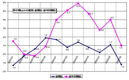 GDP:2005年第3四半期のGDP(暫定値)が発表され、市場の予想を大幅に下回る前期比▲1.2%のマイナス成長となった。この要因としては、前期好調だった固定資本形成が4.7%→▲0.9%、政府消費支出も0.9%→▲0.4%と大きく減少してマイナスに転じたことが挙げられる(グラフ1)。部門別では、農業が1.7%→▲3.4%、工業が1.4%→▲1.2%と前期比大幅に減少したことが大きく影響した(グラフ2)。