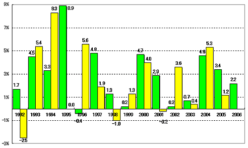 2006年第2四半期のGDP(暫定値)が発表されたが、事前の予測を下回り、前期比0.5%、前年同期比1.2%という低い成長率となった(グラフ1)。前期比では家計消費支出が1.2%と好調であったものの、輸出が▲5.1%、投資を示す固定資本形成が▲2.2%、輸入も▲0.1%と落ち込んだことが影響した。また、部門別でも工業は▲0.3%のマイナスとなった。前年同期比では、家計消費支出が4.0%と前期比同様に高い伸びを示すとともに、為替のレアル高の影響から輸入が12.1%の成長となったのが目立つ一方、輸入は▲0.6%のマイナスとなった。