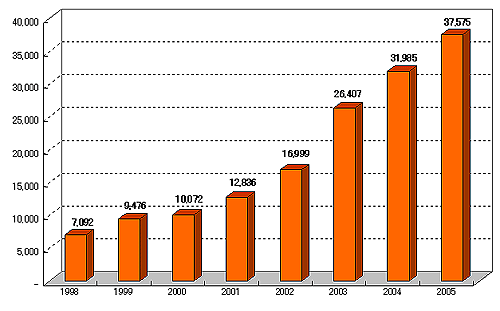 ブラジルの税負担率の高さは世界的にも有名であるが、今月、2005年の対GDP税負担率が発表され、過去最高となる37.37%を記録した(グラフ4)。対GDP税負担率に関しては、北欧諸国が約50%で、欧州をはじめとする先進国の中にも40%を超える国があるが、新興工業諸国の多くが20%前後であることを考えると、ブラジルの税負担率は非常に高いレベルにあるといえる。