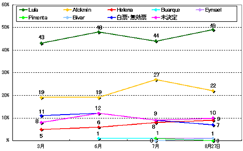 今月27日に行われた大統領選挙に関する世論調査(IBOPE)において、Lula大統領が再び支持率を伸ばし、現時点で選挙が行われた場合、第1回目の投票でLula大統領が再選されるという結果となった(グラフ6。以下のグラフにおける調査実施時期の間隔は不定期)。今月半ばに行われた同調査では、PSOL(自由と社会主義政党)のHelena候補が一時12%まで支持率を伸ばし、PSDB(ブラジル社会民主党)のAlckmin候補を含めた3つ巴の展開を呈するかと思われた。しかし、8月15日からスタートした選挙戦のテレビ放映が進むにつれ、急進的なHelena候補に対する拒絶票が7月の19%から26%へと上昇すると共に、同候補への支持率が低下。また、Alckmin候補への拒絶票も17%から21%へと上昇する一方、32%だったLula大統領への拒絶票は24%へと低下し、Lula大統領が支持率を伸ばすかたちとなった。今回のAlckmin候補の支持率低下には、同氏がPCCによる治安問題悪化が取り沙汰されたサンパウロ州の前州知事であったことなどが影響したと考えられよう。