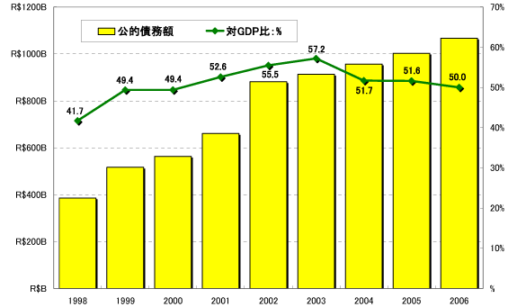 今月、2006年の国内財政に関する諸指標が発表された。連邦政府、州およびムニシピオ(市)政府、公社のプライマリー・サープラス(利払い費を除く財政収支黒字)の合計はR$901.44億、対GDP比で4.32%となり、政府の目標値4.25%を達成した(グラフ2)。しかしながら、公的債務額が対GDP比で50.0%と昨年よりも若干減少したものの、総額ではR$1兆673.6億と2年連続でR$1兆を超えるとともに(グラフ3)、社会保障費赤字額はR$420.65億となり、対GDP比でも2.01%へと増加した(グラフ4)。今後、無駄な公費削減や社会保障制度の更なる改革による財政改善が大きな課題といえよう。