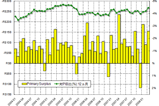 月末の30日、米国の格付け会社スタンダード&プアーズ(S&P)が、ブラジルの長期外貨建てソブリン格付けをBBプラスから投資適格級であるBBBマイナスへと引き上げた。ブラジルにとって投資適格級の格付けは史上初であり、近年、市場において同国の信用力が高っていることを反映したものとされる。実際に、ブラジルの失業率(6大都市圏)は昨年10月から8%台以下で推移し、財政収支もプライマリー・サープラス(利払い費を除く財政収支黒字)は政府の2008年目標である対GDP比3.8%を上回っている(グラフ2)。また、政治的なリスクなどを反映しやすいカントリー・リスクも、2004年5月をピークにその後は安定している(グラフ3)。さらに、今年の1月にブラジルは対外資産の総額が史上初めて対外債務総額を上回り、債務国から債権国へとなっている(2008年2月レポート経済欄参照)。