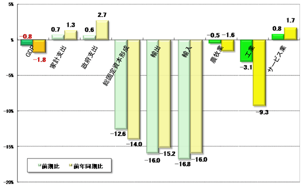 また部門別では、世界的な需要減退により製造業(前年同期比▲12.6%)が大打撃を受けたため、工業部門が前期に引き続き大きく落ち込むこととなった。また、サービス業は前期と前年同期比でプラス成長を記録したが、輸出向け農業産品も含む農牧業部門は今期もマイナス成長となった。しかし、工業と農牧業ともに前期比のマイナス幅が2008年第4四半期よりも縮小しており、このことは、主に前述の政府と家計の支出に下支えされた国内市場を足がかりにしたものと考えられる。