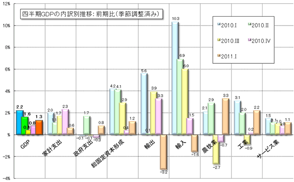 第1四半期GDPの需要面を見ると、最近の経済成長を牽引してきた家計支出(前期比0.6%、前年同期比5.9%)の伸びが、特に前期比において大きく鈍化した。これは前述のように、主に政府の対策により耐久消費財購入のための融資条件が厳しくなったことや、物価の高い状況が続いたことが影響したと考えられる。ただし、この家計支出の減退は物価上昇を抑えることから、インフレ目標達成にとっては良い傾向だといえる。また、政府支出(同0.8%、同2.1%)と総固定資本形成(同1.2%、同8.8%)は2010年第4四半期より成長したが、物価と金利の先行きが不透明なこともあり、今後も依然変動幅の大きい状況が続くと見られている。さらに貿易に関しては、輸出(同▲3.2%、同4.3%)と輸入(同▲1.6%、同13.1%)となり、輸出入とも前年同期比ではプラスだが前期比ではマイナスとなった。しかしながら前期比でのマイナスは、2010年の数値が世界金融危機直後の2009年をもとにしていることが影響しており、コモディティへの需要は依然高いこともあり、今後ブラジルを取り巻く貿易環境については楽観的な見方が多くされている。
