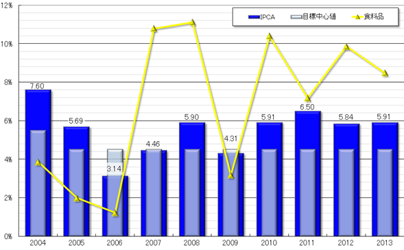 また2013年通年では、食料品に関して外食(2012年9.51%→2013年10.07%)の値段が上がり、品目としては茶(同23.00%→53.33%)や小麦粉(同7.30%→30.16%)が高騰した一方、2012年に値上がりしたフェイジョン豆(carioca:同31.53%→▲17.32%)や大豆油(同23.57%→▲17.09%)はマイナスを記録した。また非食料品に関しては、住宅分野(同6.79%→3.40%)と個人消費分野(同10.17%→8.39%)で伸び率が低下したが、大幅に値上がりした家財分野(同0.84%→7.12%)や運輸交通分野(同0.48%→3.29%)をはじめ、その他の分野でも伸び率が高くなった。