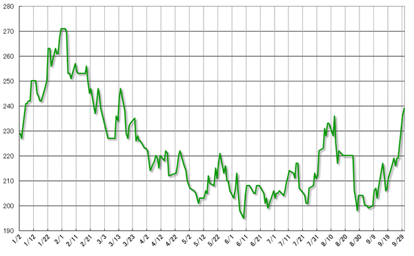 貿易収支: 9月の貿易収支は、輸出額がUS$196.17億(前月比▲4.1%、前年同月比▲6.6%)、輸入額がUS$205.56億(同+6.5%、同+9.0%)で、貿易収支は9月として1998年以降で最大の赤字額となる▲US$9.39億(同▲180.5%、同▲143.8%)を記録した。また年初からの累計は、輸出額がUS$1,736.35億(前年同期比▲2.3%)、輸入額がUS$1,743.25億(同▲2.8%)で、貿易収支は▲US$6.90億(同▲57.1%)と再び赤字へと転じた。