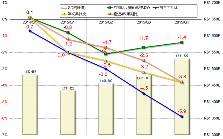 2015年GDP:2015年の年間と第4四半期のGDPが発表され、年間(2015年換算)はR$5兆9,043.3億(▲3.8%)で、1996年に現行の算出方法が採用されて以降で最大のマイナス成長を記録し、経済状況が深刻化した現状を象徴するものとなった(グラフ1)。またドル換算(時価)でも、為替相場のドル高レアル安の影響によりUS$1兆7,763.8億(▲26.5%)と大幅に減少した。また、1人当たりGDPはR$28.876(▲4.6%)で、ドル換算(同:概算)ではUS$8,688(▲27.1%)となり、2009年(US$8,642)以来の1万ドル未満の数値となった。