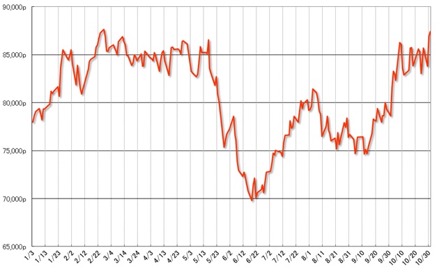 ただし月末に向け、Bolsonaroが当選する確率が高いまま大統領選挙戦が終了することになったことや、急落した米国株が反発したことでBovespaも上昇。28日(日)に行われた大統領選の決選投票でBolsonaroが勝利したことを受け、週明けの株式市場は一旦上昇したが、米国が追加の対中関税措置を講じるとの報じられた影響で株価は値を下げた。しかし、新大統領に選出されたBolsonaroが、来年1月の就任前となる今年中にもTemer政権の協力を得て年金改革などに一部着手する意向を示したことで急伸し、月末は前月末比10.18%もの上昇となる87,421pで10月の取引を終了した。