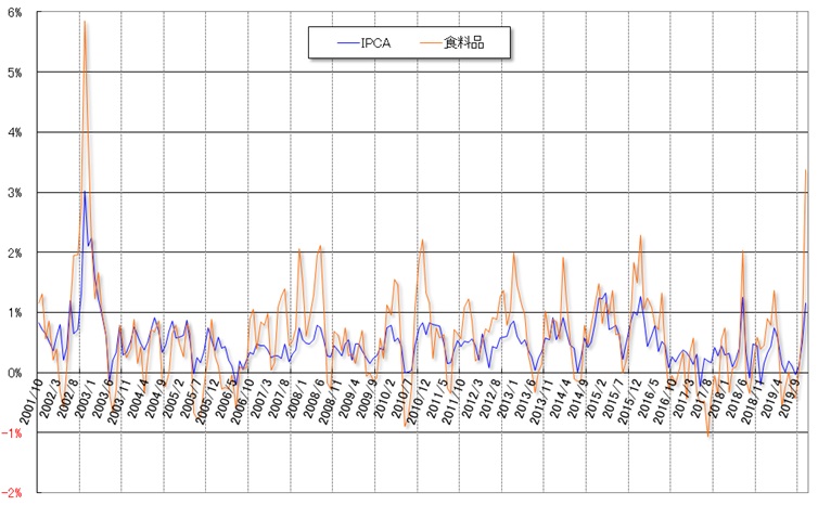 2019年通年では、飲食料品分野が6.37%(前年比2.33%p)で、日常的に食されるフェイジョン豆(carioca:2018年4.55%→2019年55.99%)、ニンニク(同▲10.81%→33.50%)、牛肉(同2.25%→32.40%)の伸びが顕著だった一方、トマト(同71.76%→▲30.45%)やニンジン(同12.59%→▲14.01%)は前年の高騰から一転して大幅に下落した。また、健康・個人ケア分野(同3.95%→5.41%)が飲食料品分野に次ぐ高い伸びとなり、教育分野(同5.32%→4.75%)や個人消費分野(同2.98%→4.67%)も上昇が顕著だったなか、家財分野(同3.74%→▲0.36%)が唯一マイナスを記録した。