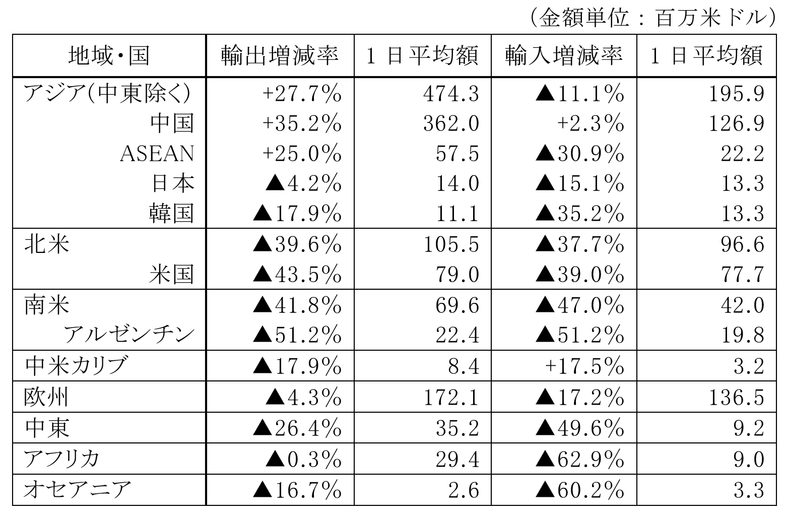 貿易収支:5月の貿易収支は、輸出額がUS$179.40億(前月比▲2.0%、前年同月比▲13.1%)、輸入額がUS$133.92億(同+15.3%、同▲10.5%)で、貿易収支はUS$45.48億(同▲32.1%、同▲20.0%)の黒字額だった。年初からの累計は輸出額がUS$853.01億(前年同期比▲7.0%)、輸入額がUS$689.52億(同▲2.5%)で、貿易黒字額はUS$163.49億(同▲22.2%)だった。